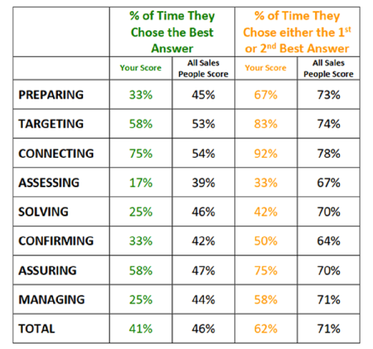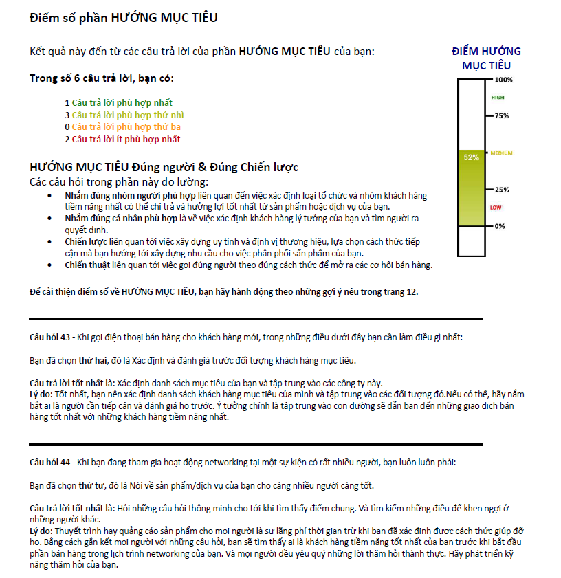 Đây không phải là một đánh giá về trí thông minh nói chung của bạn, mà chỉ liên quan đến bán hàng. Tuy nhiên, trí thông minh bán hàng có thể được tăng lên thông qua học tập. Điểm số trong Đánh giá này cho bạn biết mức độ sẵn sàng và phù hợp với việc bán hàng. Nó không thể cho bạn biết liệu bạn sẽ bán được hàng hay không nhưng nó chắc chắn cho bạn thấy bạn hiểu rõ về bán hàng và sẽ tiếp cận bán hàng như thế nào.